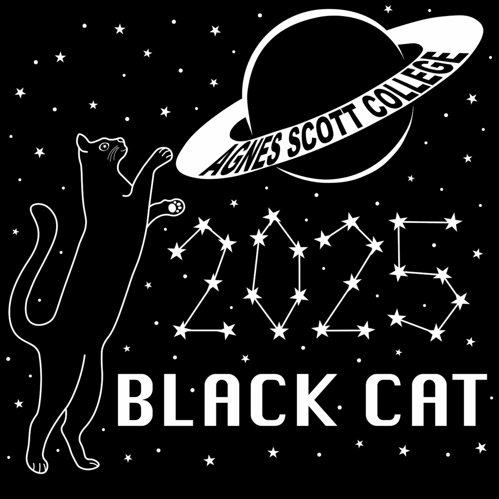 This is a graphic that I made in Adobe Illustrator to submit to a T-shirt design contest for Agnes Scott’s annual festivity, Black Cat Week. The theme for this year was “space”, which I alluded to with the text “Agnes Scott College” warping in a swoop as the ring of Saturn and the text “2025,” which I drew as an imaginary constellation, blending into the rest of the design with a field of stars for a background. The primary element of this design is the contrasting line drawing of a cat stretching to paw at the ring around Saturn. (This also references the playful mood of the event and the History of Black Cat as a “prank night”.)