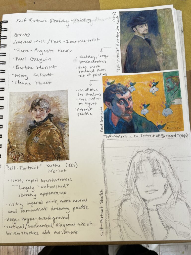 Before starting my self-portrait, I sketched out the overall composition, and researched artists that would inspire me stylistically for this painting. I took inspiration mostly from Berthe Morisot.