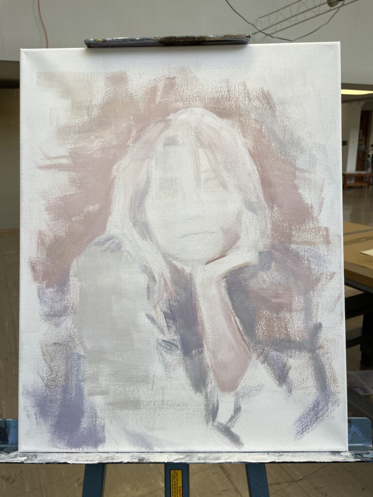 The color palette I chose consisted of tan browns, purples, and pinks. On the actual canvas, I first loosely blocked out some shapes and shadows. I’ve found this helps make the process of a portrait feel less daunting.